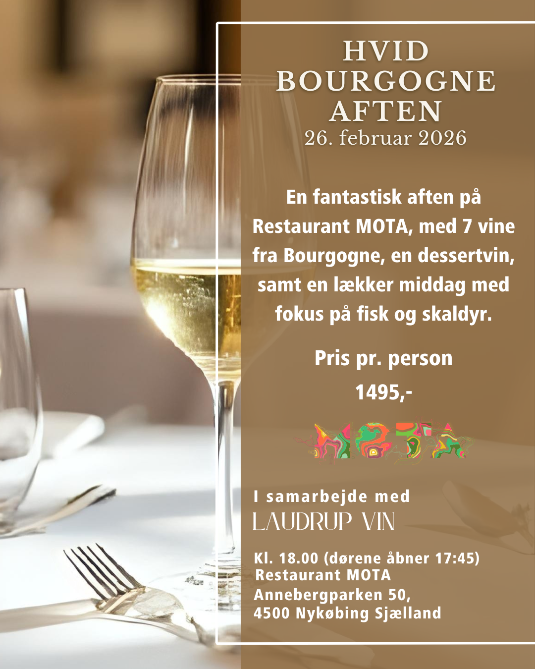 I samarbejde med Laudrup Vin og Restaurant MOTA inviteres du til en eksklusiv vinmiddag i restaurantens smukke selskabslokale. Aftenen indledes med et glas udsøgt crémant fra Bourgogne, hvorefter der serveres seks nøje udvalgte hvide Bourgogne-vine, ledsaget af en afsluttende dessertvin*.
